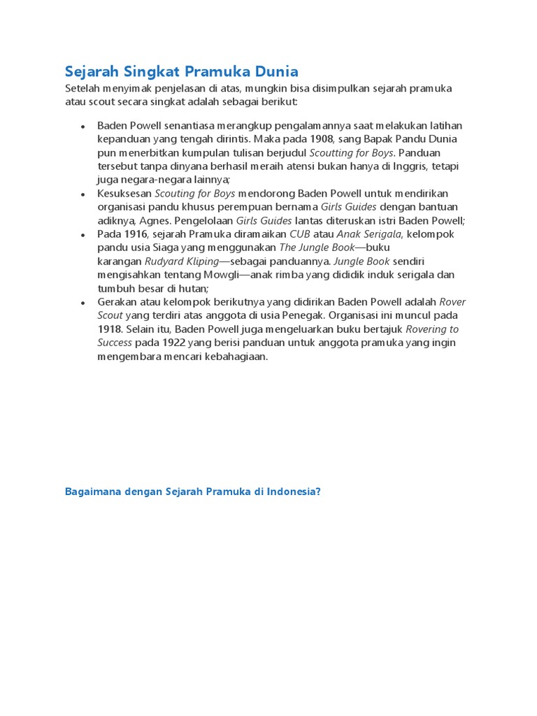 Sejarah Pramuka Indonesia Singkat Brainly Co Id. Sejarah pramuka dunia sudah dimulai sejak awal abad 20. Buku itu dibuat sebagai panduan dalam kegiatan perkemahan yang diprakarsainya. Setelah sumpah pemuda, kesadaran nasional masyarakat indonesia semakin meningkat. Sejarah pramuka di dunia dimulai ketika baden powell membuat buku berjudul scouting for boys pada tahun 1908 yang berisi pengalamannya ketika sebagai tentara. Buku itu kemudian populer dan laris tidak hanya di. Pramuka adalah organisasi pemuda untuk membentuk karakter kuat, tahan banting namun tetap memiliki jiwa social itulah uraian singkat mengenai sejarah pramuka di indonesia dan di dunia. Nah itulah referensi sejarah pramuka seindonesia dan sedunia juga. Disini kami ulas sejarah lengkap pramuka indonesia dan dunia. Bagaimana sejarah singkat dan awal mula gerakan ini terbentuk dan mendunia atas prakarsa bapak pramuka dunia, lord robert baden powell. Lengkap membahas sejarah pramuka di indonesia dan dunia. Dilanjutkan tahun 1908, sejarah kepramukaan indonesia dan dunia oleh powel menulis sebuah buku prinsip dasar kepramukaan. Organisasi tersebut berna nederland indische padvinder veviniging (nipv). Sementara sejarah pramuka di indonesia baru mulai diresmikan pada tahun 1961. Sejarah kepramukaan di dunia telah ada sejak awal abad 20, sementara sejarah. Semoga tulisan singkat ini bisa menambah informasi yang dibutuhkan.