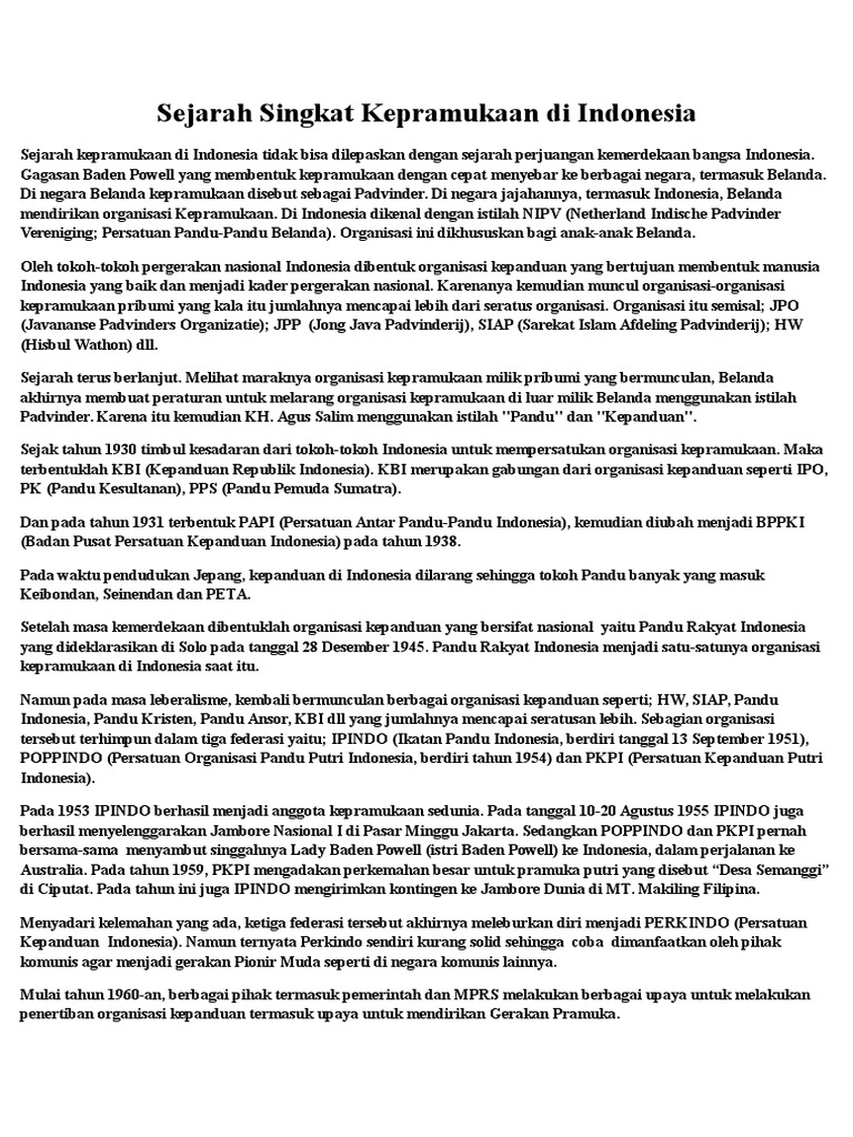 Doc Sejarah Pramuka Jordy Alexi Academia Edu. Gagasan baden powell yang membentuk kepramukaan dengan cepat menyebar ke berbagai negara, termasuk belanda. Kemudian pada tahun 1916, organisasi tersebut berganti nama menjadi. Cikal bakal pramuka indonesia adalah didirikannya organisasi nederlandsche padvinders organisatie (npo) bentukan belanda. Sejarah pramukan di dunia dimulai dari negara inggris. Sejarah pramuka di indonesia tidak terlepas dari gagasan baden poweli yang merupakan bapak pandu sedunia. Sejarah pramuka scouting yang di kenal di indonesia dikenal dengan istilah kepramukaan, dikembangkan oleh lord baden powell gerakan pramuka dengan lambang tunas kelapa di bentuk dengan keputusan presiden republik indonesia nomor 238 tahun 1961, tanggal 20 mei 1961. Yuk kenali sejarah pramuka di indonesia dan dunia secara singkat. Sejarah kepramukaan di indonesia tidak bisa dilepaskan dengan sejarah perjuangan kemerdekaan bangsa indonesia. Penjelasan singkat mengenai sejarah pramuka di indonesia dan dunia yang mudah dipahami. Bagaimana sejarah singkat dan awal mula gerakan ini terbentuk dan mendunia atas prakarsa bapak pramuka dunia, lord robert baden powell. Lengkap membahas sejarah pramuka di indonesia dan dunia. Di negara belanda kepramukaan disebut sebagai padvinder. Yuk kita diskusi dan saling menukar informasi tentang materi kepramukaan dan seputar kegiatan kepramukaan jangan lupa like dan suscribenya kakak dan. Sejarah gerakan pramuka di indonesia dimulai sejak tahun 1912. Sejarah pramuka dunia pertama dimulai saat baden powell ✅ menulis pengalamannya dalam buku scouting for boys (1908), sedangkan di beliau mendapat julukan sebagai bapak pramuka karena telah mendirikan gerakan pramuka di dunia.
